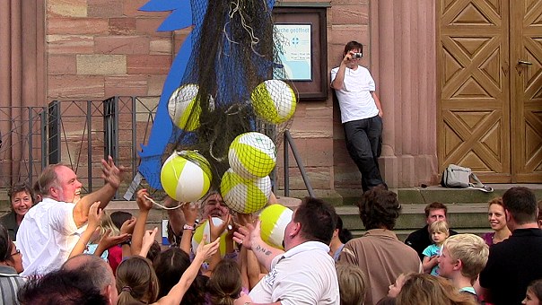 Zum Start der Foto-Aktion "Sommer - Sonne - Wasserball" (wir berichteten) sollten um 19.30 Uhr an der Michaelskirche jede Menge EWG-Wasserbälle vom Himmel fallen. Ein großer Kranwagen stand bereit, an dem das Netz mit den Bällen hing. Zahlreiche Kinder hatten sich darunter versammelt und warteten gespannt auf den Ballregen. Doch die Technik versagte, und so musste das Netz am Boden von Hand geöffnet werden. Die Bälle fanden trotzdem reißenden Absatz, und man darf auf die fotografischen Ergebnisse gespannt sein.