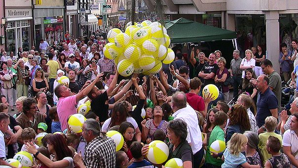 Zum Startbild (hr) Mit einem sommerlichen Straßenfest zum Einkaufen und Genießen startete die Eberbacher Werbegemeinschaft (EWG) am Freitagabend in der Innenstadt ihre Sommer-Werbeaktion 2012, in deren Mittelpunkt viele Wasserbälle stehen.