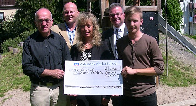 Robin Herr, Auszubildender bei GELITA, und seine 23 in der Ausbildung befindlichen Kolleginnen und Kollegen sammelten im Frühjahr in der Eberbacher Geschäftswelt Tombolapreise für diese Aktion. Man habe sich über die Unterstützung durch die Firmeninhaber sehr gefreut, versicherten er und Ilona Grimm von der Personalabteilung, die diesen sozialen Teil der Ausbildung mitgestaltet, und auch Firmensprecher Michael Teppner. Die Herausforderung, insgesamt 2.000 Lose am Frühlingsfest-Wochenende zu verkaufen, meisterten die jungen GELITA-Mitarbeiter in der Zeit von Samstagnachmittag und Sonntag weit vor Ende des Festes. Die Preise waren im Foyer der Stadthalle aufgebaut und konnten dort von den Gewinnern abgeholt werden. Mit 2.000 Euro Erlös gab sich das Team aber nicht zufrieden, sie wollten 3.000 Euro für den sozialen Zweck spenden. Mit einer Sammelaktion im Kollegium in der Hauptverwaltung und einer Spende von der Geschäftsleitung war das Ziel erreicht. Am Donnerstagvormittag überreichten Grimm, Herr und Teppner den Scheck an Georg Blasel, Leiter des Paulusheims in Eberbach.