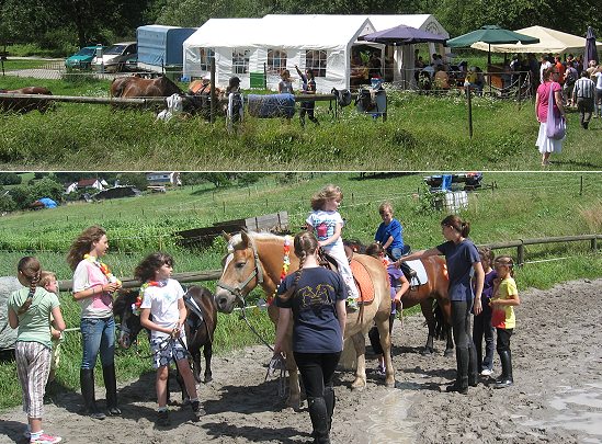 Am Nachmittag schien wieder die Sonne und so zeigten die Reiterinnen und Reiter des Vereins ihr Können bei verschiedenen Reit- und Voltigiervorführungen. Gemäß dem Motto „Hawaii“ waren die Reiterinnen und Reiter und auch die Pferde mit Blumenketten geschmückt. Die Moderation des Nachmittags lag in den Händen von Emma Auer. Im Anschluss daran wurde Ponyreiten angeboten und auch eine Hüpfburg stand bereit.