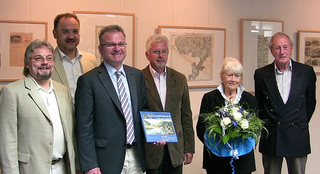 Neckartalmotive aus dem Archiv geholt Dr. Rüdiger Lenz, Eberhard Petri, Bernhard Martin, Rainer Mathes, Theda Arnold und Leslee Johnson (v.l.) sahen sich gemeinsam die Ausstellung in Eberbach an. (Foto: Claudia Richter)(cr) Graphiken mit Neckartalmotiven aus dem 19. Jahrhundert zieren seit einigen Tagen die Wände im Eberbacher Rathaus. Die Exponate sind Teil einer Sammlung, die im Stadtarchiv in Eberbach aufbewahrt wird.