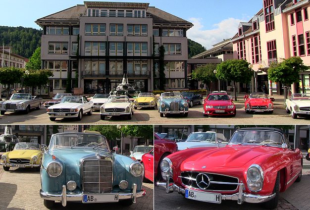Die Autos vom Typ Mercedes Benz SL gehören allesamt einem privaten Sammler aus dem Raum Aschaffenburg. Einmal im Jahr lädt er Familie und Freunde zu einer Ausfahrt ein, damit die edlen Stücke mal wieder bewegt werden. Heute ging es durch den Odenwald nach Eberbach. Das erste Ziel der Gruppe in Eberbach war, nachdem die Autos mit Sondergenehmigung vom städtischen Ordnungsamt auf dem eigentlich gesperrten Leopoldsplatz abgestellt waren, das Viktoria-Café mit der berühmten gleichnamigen Torte.