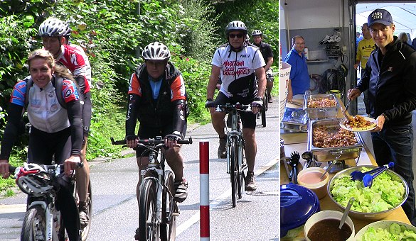 Lauf- und Bikespaß rund um Eberbach Radsportler auf der Strecke. Rechts Timo Bracht am Nudelbuffet bei der Stärkung nach dem Lauftraining. (Fotos: Hubert Richter)(hr) Zu einem außergewöhnlichen Sportevent lud gestern die Volksbank Neckartal alle Rad- und Laufsportbegeisterten ein.