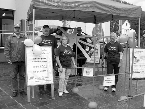 DGB prangert den kommunalen Schutzschirm an (Foto: privat)(bro) (str) Der sogenannte "Kommunale Schutzschirm" ist mehr Loch als Schirm", machte der DGB-Ortsverband Hirschhorn kürzlich mit einer kreativen Straßenaktion vor dem Hirschhorner Rathaus deutlich. Mit einem großen Sonnenschirm, von dem bis auf wenige schwarz-gelb bemalte Stoff-Fetzen der komplette Stoff entfernt wurde, brachte der DGB Hirschhorn die "Mogelpackung Schutzschirm" auf den Punkt. Mit etlichen Hürden, an den Zitate aus dem "Konsolidierungshandbuch" des Landes Hessen angebracht waren, wurden zudem die Auswirkungen des "Schutzschirms" plastisch veranschaulicht.