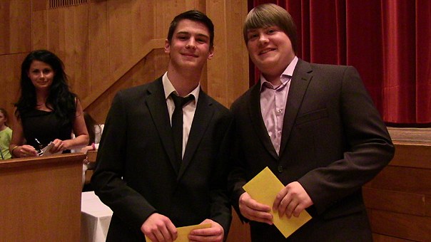 117 Schulabgänger erhielten ihre Zeugnisse Stefan Buchwald und Maximilian Böhme (v.l.) wurden durch die Lehrerin Isabell Jung (l.) für ihren Einsatz in der SMV geehrt. (Foto: Hubert Richter)Mehr Bilder (Klicken zum Vergrößern):
