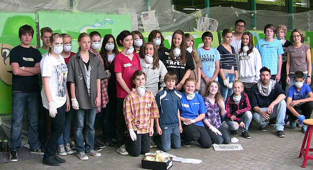 Gewinnsumme wurde in Kunstprojekt investiert (Foto: Claudia Richter)(cr) Im Sommer des vergangenen Jahres gewannen Schülerinnen und Schüler der Eberbacher Realschule beim Wettbewerb "Jugend baut..." 1.000 Euro (wir berichteten). Mit diesem Geld wurde jetzt ein Graffiti-Projekt an der Schule finanziert.