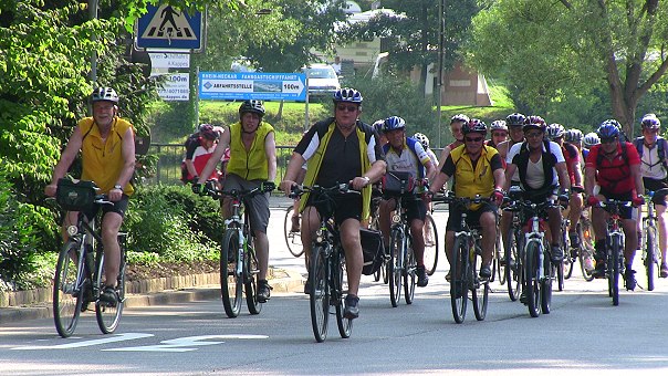 (hr) Zum Abschluss der ersten Etappe des diesjährigen "3-Länder-Rad-Events" trafen knapp 300 Radlerinnen und Radler heute gegen Abend in Eberbach ein. Auf dem Leopoldsplatz wurde für sie und mit ihnen ein großes Fest gefeiert.