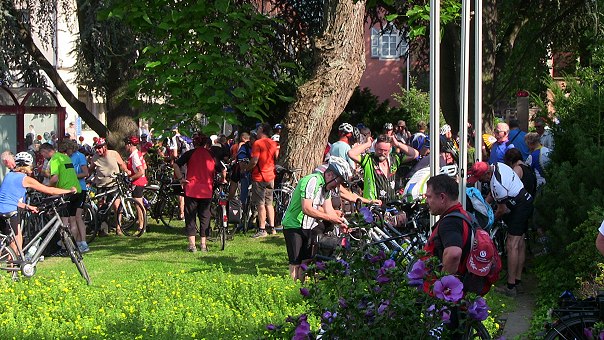 (hr) Zum Abschluss der ersten Etappe des diesjährigen "3-Länder-Rad-Events" trafen knapp 300 Radlerinnen und Radler heute gegen Abend in Eberbach ein. Auf dem Leopoldsplatz wurde für sie und mit ihnen ein großes Fest gefeiert.