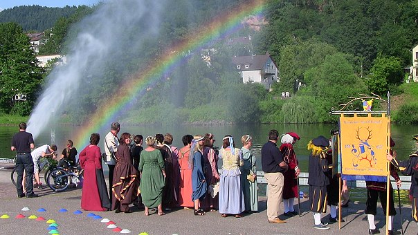 Akteure in Hirschhorn auf der mobilen Bühne des RNF-Actiontrucks waren neben Bürgermeister Rainer Sens vor allem Repräsentanten der Hirschhorner Ritter sowie Jürgen Waibel alias "Ritter Friedrich". Sens musste nach dem Fassbieranstich noch das Bürgermeisterquiz lösen, bei dem er sich aber von drei "schlauen" Hirschhornern unterstützen lassen konnte. "Ritter Friedrich" durfte beweisen, wie gut er sich in der Metropolregion auskennt, und ein Ensemble der Hirschhorner Ritter intonierte eine Hirschhorn-Hymne zur Melodie von "Country Roads". Für Abwechslung sorgten drei Rapper mit einer Hip-Hop-Einlage. Auf der separaten Musikbühne boten zwischendurch die Folkgruppe "Heebie Jeebies" und die Western-Band "Country Kisses" musikalische Unterhaltung. Die Stadtwette, in der es galt, mindestens 30 Hirschhorner in historischen Gewändern auf die Bühne zu bringen, wurde mit Bravour gewonnen. Einen großen Präsentkorb durfte Heike Schön-Leucht von der Tourist-Info in Empfang nehmen.