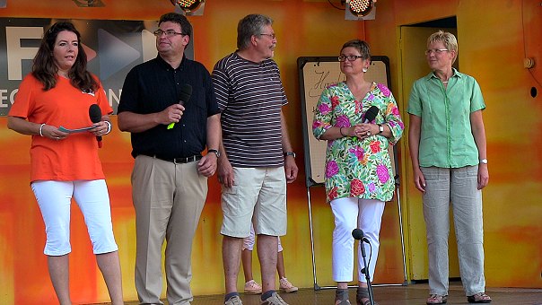 Die Teilnehmer der Sommertour in diesem Jahr sind außer Hirschhorn noch Ketsch, Walldürn, Jockgrim, Rauenberg, Neckargerach und Meckenheim. In jeder der Gemeinden werden Fernsehshows aufgezeichnet, die dann im RNF zu sehen sind. Punkte gibt es vorort bei der Aufzeichnung in Form von Sonderpunkten, aber auch durch Klicks auf der RNF-Website und eben durch das Telefonvoting. Wer für Hirschhorn abstimmen möchte, kann das bis einschließlich Sonntag, 9. September, unter Tel. 01378 8818183 tun (Anrufe sind kostenpflichtig). Die "Perle des Neckartals" hat heute gut vorgelegt: Mit 97 Sonderpunkten, die Kinderassistentin Julia Stangl an der Tafel auf der Bühne sammelte, setzte sich Hirschhorn in dieser Disziplin auf Platz 1.