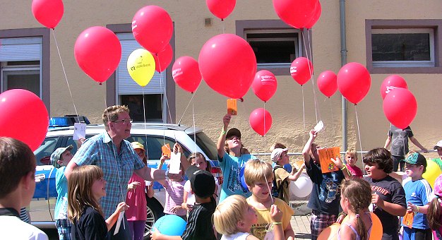 Im Hof in der Kellereistraße ging es hoch her bei den Spielen rund um den Luftballon, bei denen sowohl Teamgeist als auch Einzelleistungen gefragt waren. Aufsehen erregte die große Gruppe besonders auf dem Neuen Markt und in der Kellereistraße, als die Kinder jeweils 55 Luftballons steigen ließen, mit denen die Mädchen und Jungen am "Ferien-Spaßprogramm-Luftballonwettbewerb 2012" teilnahmen und mit etwas Glück auch noch gewinnen können. Laut Braner erhalten die drei Teilnehmer, deren Ballon am weitesten geflogen ist und der spätestens am 16. September nach Eberbach zurück geschickt wird, attraktive Preise. Gestern schon erhielten alle Teilnehmerinnen und Teilnehmer ihre "Fluglizenz für Luftballons" als Erinnerung an das erste Luftballonfestival im Polizeirevier.