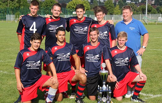 Erfolgreiches Fußballturnier der Eberbacher Adler-Freunde Die Sieger-Mannschaft Joma Teamsport mit Dirk Lenz, Vorsitzender der Adler-Freunde (Foto: privat)(ko) Am vergangenen Samstag luden die Adler-Freunde Eberbach zu ihrem 11.Fanclub- und Hobbyfußballturnier auf das Sportgelände in der Au ein. Auf Grund des starken Gewitters am frühen Vormittag überlegte man das Turnier komplett abzusagen, da aber von den 13 gemeldeten Mannschaften aus Eberbach, Wald-Michelbach, Heidelberg und Mannheim 11 Teams pünktlich erschienen und der Himmel doch noch seine Regenpforten schloss, konnte das Turnier dann schließlich doch stattfinden.