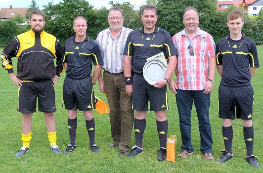 Anlass für diese Partie war neben dem Testcharakter ein ganz besonderer: Der Topschiedsrichter des SV 1924 Beerfelden - Bernd Bechtold - leitete sein 1.000 Fußballspiel. Bechtold legte seine Schiedsrichterprüfung im Jahre 1996 ab und glänzt seitdem als Muster an Zuverlässigkeit auf ganz hohem Niveau. Legt man diese 1.000 Spiele um, so ergibt sich die Zahl von knapp 63 Spielen pro Jahr, die er während dieses Zeitraums jedes Jahr geleitet hat. In der Ehrung vor dem Spiel betonten Kreisschiedsrichterobmann Hartmut Schwöbel und sein Stellvertreter Klaus Ehrhard, dass dies keinesfalls selbstverständlich sei und verdeutlichten auch noch einmal, dass die Zuverlässigkeit mit sehr guten Leistungen einhergehe. Auch der erste Vorsitzende des SVB, Robin Hemberger, betonte in ein paar kurzen Sätzen noch einmal die Wichtigkeit des Faktors Bernd Bechtold - mittlerweile auch in die Vorstandsarbeit involviert - innerhalb des Konstrukts SV Beerfelden. Auch Bernd Bechtolds Lebensgefährtin wurde in den kurzen Ansprachen entsprechend gewürdigt, denn ohne Unterstützung ließe sich ein solch hoher Aufwand für ein Hobby gar nicht ableisten.