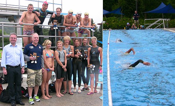 Noch bis zum kommenden Freitag sind die Sportlerinnen und Sportler, unter ihnen Timo Bracht aus Eberbach, Georg Potrebitsch und Horst Reichel vom 21run Triathlon Team und weitere deutsche Meister, Europa- und Vize-Europameister sowie ehemalige Weltmeister beim Lauf- oder Fahrradtraining in Eberbach und Umgebung anzutreffen oder beim Schwimmen im Freibad in der Au zu beobachten. Bracht hat speziell für diese Schwimmtrainingseinheiten von 8.30 Uhr bis 10.30 Uhr zwei Schimmbad-Bahnen ab 29. Juli gemietet. Die sportlichen Badegäste zahlen ebenso ihren regulären Eintritt wie die Schwimmerinnen und Schwimmer, die an jedem Morgen ihre Bahnen ziehen und teilweise wenig Verständnis für die Abtrennung der Bahnen zeigen. So brachte beispielsweise gestern Vormittag ein Badegast seine Meinung über die Mitbenutzung des Schwimmbeckens durch die Spitzensportler mit eher unhöflichen Worten zum Ausdruck. Die meisten Badegäste jedoch sehen es gelassen, viele freuen sich darüber, den Schwimmathleten bei der Arbeit zusehen zu können, und eine Dame nutzte gar die Gunst der Stunde und zog gemächlich ihre Bahnen inmitten der Profis.