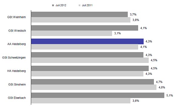 Schwächere Entwicklung auf dem Arbeitsmarkt Arbeitslosenquoten im Juli. (Grafik: Bundesagentur für Arbeit)(bro) (aa) Seit Juli werden dem Heidelberger Bezirk auch die Geschäftsstellen Schwetzingen und Weinheim zugeordnet. Von Juni auf Juli ist die Arbeitslosigkeit um 301 auf 14.774 Personen gestiegen. Gegenüber dem Vorjahr nahm die Zahl der arbeitslosen Menschen um 816 zu. Die Arbeitslosenquote beträgt im Juli 4,3 Prozent.