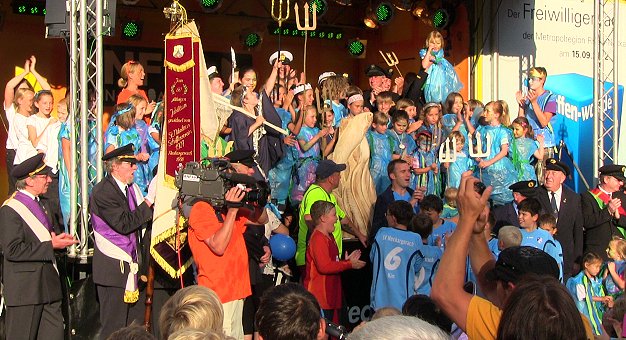 Bei der Stadtwette galt es, mindestens 30 Kinder auf die Bühne zu bringen, die als Wassermann oder Meerjungfrau Arielle verkleidet sind. Das war dank guter Vorbereitung überhaupt kein Problem und brachte allein 50 Sonderpunkte ein.