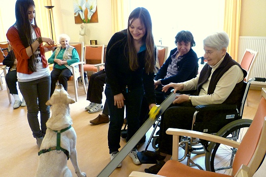 Die Hunde haben gelernt, mit den Senioren zu spielen. Interessiert und freundlich gehen die Hunde auf die Senioren zu, lassen sich streicheln und warten gespannt auf ihre Aufgaben. Da werden Papierbälle mit Leckerli-Füllung gebastelt, von den Hunden apportiert, und die Teilnehmer der lustigen Runde freuen sich die Bälle wieder auseinanderfalten zu dürfen, um dann die Hunde mit den Leckerlis zu belohnen. Auch Memory wird mit den Besuchshunden gespielt - aber nicht mit Karten, sondern mit Gegenständen. Haushaltsgegenstände werden von „Paul" zu den Personen apportiert. Am Schluss der Runde muss jeder Teilnehmer die Frage beantworten, was der Hund gebracht hat.