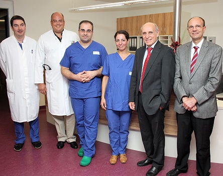 Der Personalwechsel nach einem Jahr bietet Anlass zu einer kleinen Zwischenbilanz des Eberbacher Herzkatheter-Teams: Rund 800 Eingriffe haben die vier Ärzte, assistiert von speziell dafür ausgebildetem Pflegepersonal, zwischen August 2011 und Juli 2012 vorgenommen - davon etwa 15 Prozent ambulant. In mehr als 40 Prozent der Eingriffe wurde eine Perkutane Transluminale Koronare Angioplastie (PTCA) durchgeführt, das bedeutet, dass im Rahmen der Herzkatheter-Untersuchung ein verengtes oder verschlossenes Herzkranzgefäß erweitert beziehungsweise wiedereröffnet wurde. 15 Prozent der Eingriffe bezogen sich nicht auf die Gefäße des Herzens, sondern wurden an anderen Blutgefäßen vorgenommen, beispielsweise an den Arterien der Beine, um die Ursachen für die so genannte Schaufensterkrankheit zu beseitigen.