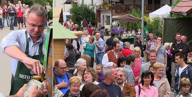 Fass angestochen und neue Broschüre vorgestellt - Kein Windrad auf dem Bannwaldskopf Freibier gab es nach dem Fassanstich. Rechts die Gäste auf der "Kerwemeile". (Fotos: Hubert Richter)(hr) In Pleutersbach wurde heute Nachmittag mit dem Fassanstich durch den Eberbacher Bürgermeister Bernhard Martin die traditionelle Straßenkerwe eröffnet.