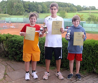 Spannung bis zum Schluss Stolz präsentieren die Sieger ihre tapfer erkämpften Urkunden und Pokale. V.l.: Martin Feuerstein (zweiter Platz), Julian Rybiak (erster Platz), Jonas Bender (dritter Platz). (Foto: privat) (bro) (rg) Bei optimalem Tenniswetter am Sonntag, 16. September, konnte die Jugend-Clubmeisterschaft 2012 wie geplant mit nahezu vollzähliger Beteiligung am frühen Morgen beginnen.