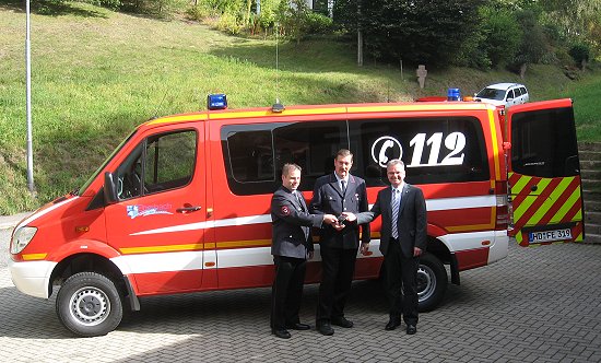 Neuer MTW für Feuerwehr Friedrichsdorf in Dienst gestellt v.l.: Gesamtkommandant Markus Lenk, Kommandant der Abt. Friedrichsdorf Ralf Böhm und Bürgermeister Bernhard Martin bei der Schlüsselübergabe (Foto: Nicole Kolbe)(ko) Am Freitagnachmittag übergab Bürgermeister Bernhard Martin im Beisein von Gesamtkommandant der Feuerwehr Eberbach Markus Lenk den Fahrzeugschlüssel für einen nagelneuen Mannschafts-Transport-Wagen (MTW) an den Feuerwehrkommandanten der Abteilung Friedrichsdorf und stellv. Gesamtkommandanten Ralf Böhm.