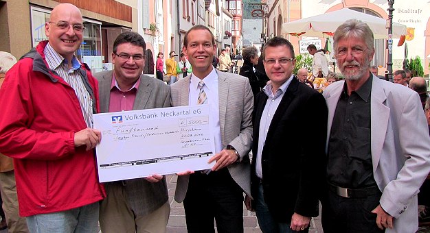 Am 17. Juni verlosten die "Gewerbetreibenden der mittelalterlichen Stadt Hirschhorn e.V." anlässlich des Aktionstags „Lebendiger Neckar“ einen gespendeten historischen VW Käfer (wir berichteten). Die Lose waren stark gefragt, so dass ein Erlös von 4.218,00 Euro erzielt werden konnte, den der Gewerbeverein für den Erhalt historischer Kulturgüter in und um Hirschhorn zur Verfügung stellen wollte. In Anbetracht der Fülle von Aufgaben beschloss der Vorstand des Gewerbevereins, den Erlös auf den runden Betrag von 5.000 Euro aufzustocken.
