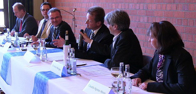 Zeitungen luden zur Diskussionsrunde im evangelischen Gemeindehaus V.l. Rudi Joho, Felix Hüll, Bernhard Martin, Peter Reichert, Christofer Menges und Claudia Agnes Henn. Beim Weinquiz erriet Martin den "Eberbacher Schollerbuckel" auf Anhieb. (Foto: Hubert Richter)(hr) Zu einer Podiumsdiskussion hatten heute Vormittag die "Rhein-Neckar-Zeitung" und ihr Tochterblatt "Eberbacher Zeitung" die Kandidaten zur Bürgermeisterwahl am 21. Oktober eingeladen. Zahlreiche Eberbacher nutzten die Gelegenheit, erstmals die Amtsbewerber gemeinsam zu erleben.