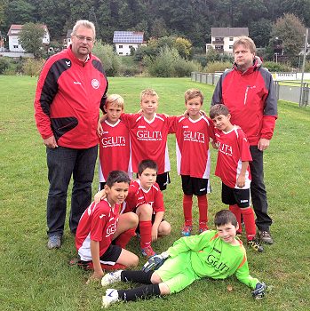 F-Junioren im neuen Outfit Die F1-Junioren des SV 1924 Eberbach in ihren neuen Trikots zusammen mit dem Jugendleiter Thomas Wäsch (li.) und Thomas Becker (re.) der Gelita AG. (Foto: privat)(bro) (twä) Über eine willkommene Trikotspende konnten sich kürzlich die F-Junioren des SV 1924 Eberbach freuen. Im Rahmen des Spieltages in Hirschhorn überreichte die Gelita AG, Eberbach durch Thomas Becker einen neuen Satz Trikots. Jugendleiter Thomas Wäsch bedankte sich für diese Unterstützung.