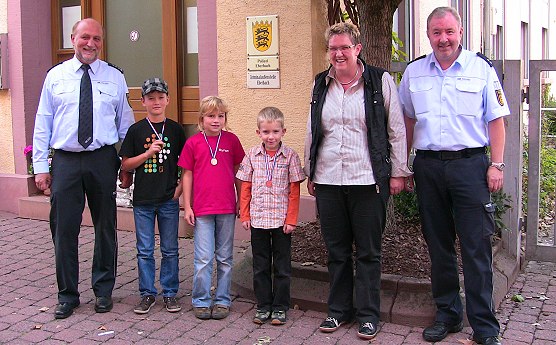 Ballonwettbewerb beim Ferienprogramm ausgewertet V.l. Erich Lindenthal, Johannes Allabar, Myriam Tewes, Simon Flachs, Martina Braner und Bernd Grimm (Foto: Claudia Richter).(cr) Beim diesjährigen Ferienprogramm wurde Ende Juli im Polizeirevier Eberbach das "1.Luftballonfestival der Polizei Eberbach" veranstaltet, bei dem insgesamt 112 bunte Ballons auf die Reise geschickt wurden (wir berichteten). Neun davon wurden gefunden und nach Eberbach zurückgeschickt. Die Besitzer der drei Luftballons, die am weitesten geflogen sind, wurden heute zur Preisverleihung eingeladen.