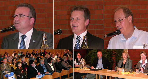 Gewerbetreibende luden Bürgermeister-Bewerber ein Bernhard Martin, Peter Reichert und Rudi Joho (v.l.) standen bei EWG und UFO Rede und Antwort. Unten rechts v.l. Susanne Reinig und Dietrich Müller (beide EWG), Monika Bergler und Ursula Clifford (beide UFO). (Fotos: Claudia Richter)(cr) Die Eberbacher Werbegemeinschaft (EWG) und das Unternehmerinnenforum Eberbach (UFO) hatten am Freitag zu einem Vorstellungs- und Informationsabend mit den Bürgermeisterkandidaten eingeladen. Rund 60 Besucher nutzten die Chance, mehr über die Bewerber und deren Vorhaben zu erfahren.