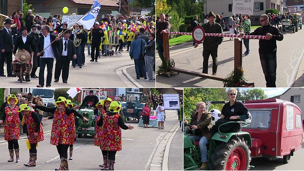 Etliche Wagen und Fußgruppen boten ein buntes Bild, als der Zug sich von der Alten Schönbrunner Straße über die L 595 zum Dorfplatz bewegte. Angeführt wurde er von Kerwepfarrer Ralph Schweizer und der Allemühler Musikapelle. Themen waren in diesem Jahr unter anderem die Windkraftnutzung, anonyme Anzeigen wegen eines fehlenden roten Punkts an einer Baustelle, nach einem Nacktbad vergessene Unterhosen, die Entwicklung des Kerwetaxis von der Urzeit bis heute und die Waldwegsperrung wegen einer einsturzgefährdeten Brücke. Für Stimmung sorgten die "Blume-Singers" mit ihrem Lied "Die Vögelein vom Titikaka-See", und weitere musikalische Unterstützung gegen Ende des Umzugs kam von der Trachtenkapelle Eschelbach.