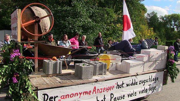 Etliche Wagen und Fußgruppen boten ein buntes Bild, als der Zug sich von der Alten Schönbrunner Straße über die L 595 zum Dorfplatz bewegte. Angeführt wurde er von Kerwepfarrer Ralph Schweizer und der Allemühler Musikapelle. Themen waren in diesem Jahr unter anderem die Windkraftnutzung, anonyme Anzeigen wegen eines fehlenden roten Punkts an einer Baustelle, nach einem Nacktbad vergessene Unterhosen, die Entwicklung des Kerwetaxis von der Urzeit bis heute und die Waldwegsperrung wegen einer einsturzgefährdeten Brücke. Für Stimmung sorgten die "Blume-Singers" mit ihrem Lied "Die Vögelein vom Titikaka-See", und weitere musikalische Unterstützung gegen Ende des Umzugs kam von der Trachtenkapelle Eschelbach.