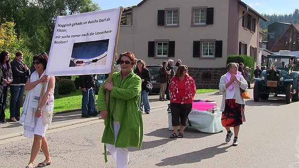 Etliche Wagen und Fußgruppen boten ein buntes Bild, als der Zug sich von der Alten Schönbrunner Straße über die L 595 zum Dorfplatz bewegte. Angeführt wurde er von Kerwepfarrer Ralph Schweizer und der Allemühler Musikapelle. Themen waren in diesem Jahr unter anderem die Windkraftnutzung, anonyme Anzeigen wegen eines fehlenden roten Punkts an einer Baustelle, nach einem Nacktbad vergessene Unterhosen, die Entwicklung des Kerwetaxis von der Urzeit bis heute und die Waldwegsperrung wegen einer einsturzgefährdeten Brücke. Für Stimmung sorgten die "Blume-Singers" mit ihrem Lied "Die Vögelein vom Titikaka-See", und weitere musikalische Unterstützung gegen Ende des Umzugs kam von der Trachtenkapelle Eschelbach.