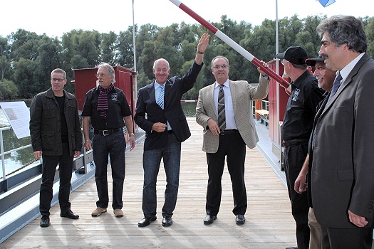 Idyllischer Ankerplatz in Leopoldshafen Das Öffnen der Fährschranke durch die Bürgermeister Peter Kirchesch (Zwingenberg) und Bernd Stober (Eggenstein – Leopoldshafen). (Foto: privat)(bro) (pk) Einen herzlichen Empfang mit fröhlicher Musik erwartete kürzlich die große Schar aus Zwingenberg bei der Einweihung der Museumsfähre „Zwingenberg II" im "Alten Hafen" von Eggenstein-Leopoldshafen.