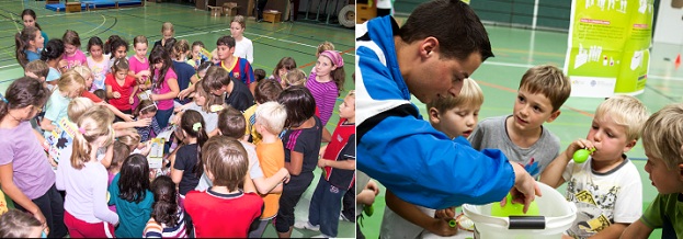 Eingeladen waren Kinder ab sechs Jahren, die an vier Stationen zu den Themen Energie, Gewicht, Lungenvolumen und chemische Analyse erlebten und erfühlten, wie Forschung funktioniert. Wie viele Kalorien verbraucht werden, erfuhren die Teilnehmer bei einem Ausdauerlauf, während beim Lauf mit Gewichten an Händen und Füßen erfühlt wurde, wie Schnelligkeit vom Gewicht der Person abhängt. Durch Aufblasen eines Luftballons wurde das Lungenvolumen getestet, was den Kindern besonderen Spaß bereitete. Das Messen des Ph-Werts von verschiedenen Flüssigkeiten war die letzte Aufgabe.