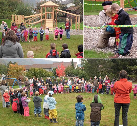 Die Kinder des Kindergartens, einige Eltern und Großeltern, der Kindergartenbeauftragte Klaus Reinhard, die Architekten Gustav Rumstadt und Lothar Holzner sowie das Kindergartenteam hatten sich im Garten versammelt, um die neu errichteten Spielgeräte einzuweihen. Dazu schnitten Klaus Reinhard und seine beiden Enkel Niklas und Ylva feierlich das Band durch, das um das gesamte Klettergerüst gebunden war. Anschließend durften alle Kinder das Klettergerüst erkunden. Natürlich kam auch das leibliche Wohl nicht zu kurz. Für alle gab es Gemüsesuppe, hergestellt aus den Zutaten vom Erntedankfest.