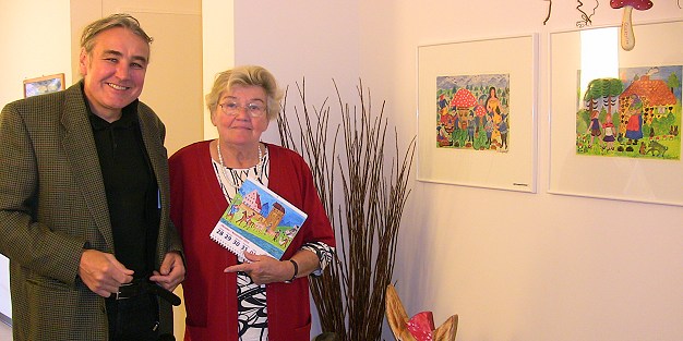 Farbenfrohe Kunst im Pflegeheim Rolf und Irmgard Wieprecht vor Bildern der 80-jährigen Künstlerin. (Foto: Claudia Richter)(cr) Eine Ausstellung mit Bildern der Malerin Irmgard Wieprecht ist jetzt im Haus der Pflege "Lebensrad" in Eberbach zu sehen. Bekannt wurde die Künstlerin unter anderem durch ihre Gemälde, die seit vielen Jahren auf den Weihnachtslosen der Eberbacher Werbegemeinschaft (EWG) zu sehen sind.