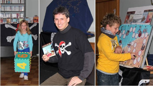 Gleich zu Beginn der Lesung hatten die Drittklässler/innen festgestellt, dass einige interessante Gegenstände den Raum schmückten, wie z.B. eine große Piratenflagge, ein Totenkopf, eine Landkarte mit einem blauen Diamanten, unter der sich ein Spielfeld versteckte, ein Plüschpapagei oder sogar eine Schatzkiste. „In jedem meiner Bücher aus dieser Reihe befindet sich ein Spielplan, diesen habe ich euch heute in groß mitgebracht, sowie einen bunten Riesenwürfel", erklärte Fritsche. Während des Lesens mussten die Mädchen und Jungen abwechselnd Fragen über das Buch beantworten. Wer die richtige Antwort wusste, durfte würfeln und den blauen Diamanten auf dem Spielplan vorwärts rücken. Somit tauchten die jungen Zuhörer selbst ganz in das Abenteuer mit ein. Alle waren bis zum Ende neugierig, wie die Geschichte wohl ausgehen möge. Dies wurde allerdings nicht verraten, denn das sollten die Kinder zuhause selbst lesen.