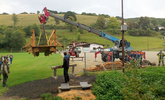 Die Vorbereitung der Bauhölzer und das Herrichten der Wiederlager erfolgte durch den Bauhof. Sechs bis acht Jugendliche aus den Jugendfeuerwehren Beerfelden und Gammelsbach trafen sich nun an drei Samstagen auf dem Trainingsplatz des SV Gammelsbach, um jeweils fünf Stunden an der Brücke zu arbeiten. Die Überwachung und Leitung der Ausführung wurde von Helmut Eifert und Jochen Neff von der FFW Beerfelden übernommen.