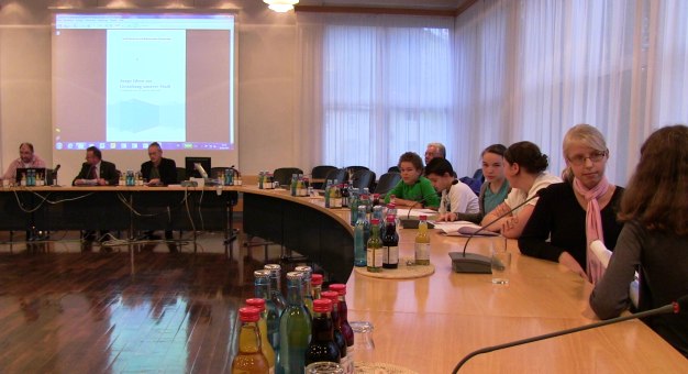 Schwach war heute die Resonanz auf die Veranstaltung. HSG-Schulleiter Helmut Schultz hatte seine Schülerinnen und Schüler begleitet, außerdem waren zwei Gemeinderatsmitglieder und zwei Eberbacher Geschäftsleute erschienen. Im Lauf des Abends fanden noch drei interessierte Zuhörer den Weg auf die Zuschauerränge. Tobias Soldner vermutete die für Geschäftsleute ungünstige Zeit um 17.30 Uhr als Grund für die zahlreichen Absagen.