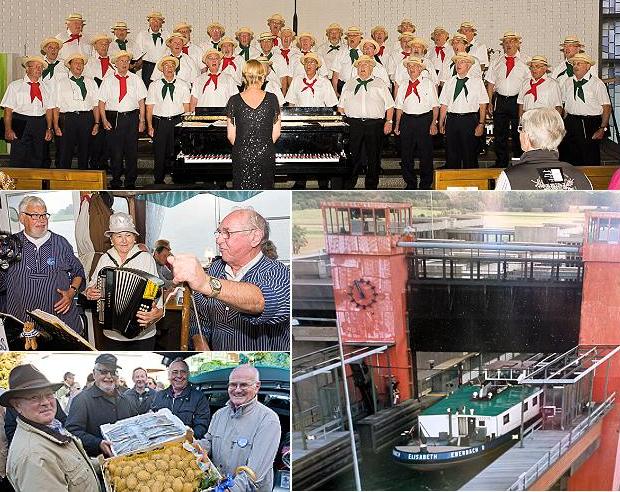 Chorreise des MGV Liederkranz Eberbach nach Geesthacht Oben: Der Liederkranz begeistert auch im Norden mit seinem italienischen Konzert-Programm. Mitte links: Sorgten für Stimmung: Die „Blauen Jungs vom Elbestrand“ mit weiblicher Verstärkung aus dem Odenwald (Gerda Siegmann). Links unten: „Wegzehrung“ für die Rückfahrt: Matjes-Heringen und Heide-Kartoffeln von den Geesthachter Sängern. Unten rechts: Überraschung im Schiffshebewerk Scharnebeck: Ein Eberbacher Schiff im Trog. (Fotos: Andreas Held)(bro) (ah) Beim letzten Besuch an der Elbe vor fünf Jahren hatte man noch bei subtropischen Temperaturen geschwitzt - „normalerweise haben wir hier immer 32 Grad - 16 Grad morgens und 16 Grad nachmittags“, bekam man damals zu hören. Dass diese Aussage einen hohen Wahrheitsgehalt hat, erlebte der MGV Liederkranz bei seinem jüngsten Aufenthalt bei der befreundeten Geesthachter Liedertafel, denn die gesamte Zeit hielt sich hartnäckig das berüchtigte Hamburger „Schmuddelwetter“. Davon ließ sich die knapp 70 Personen umfassende Reisegruppe aus Eberbach jedoch nicht die hervorragende Stimmung vermiesen.