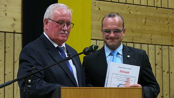 Drei Festtage für ein dreiviertel Jahrtausend Ortsgeschichte Altbürgermeister Roland Schilling (l.) überreicht im Namen der Vereine die Geschenkurkunde für einen Gedenkstein an Bürgermeister Jan Frey. (Foto: Hubert Richter)Mehr Bilder (Klicken zum Vergrößern):