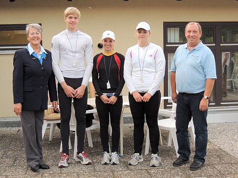 und Sofie Weber mit den RGE-Vorsitzenden Dirk Scheuenpflug und Theresia Wagner. (Foto: Ellen Wartner)(bro) (ewa) Auch bei der RGE gab es am vergangenen Wochenende viel Action. Bereits am Samstagmorgen gegen 10 Uhr starteten bei schönstem Bilderbuchwetter in Neckarelz insgesamt sechs Boote mit je vier Ruderern und einem Steuermann zum saisonalen „Abrudern“. Verstärkt durch zwei große Abordnungen der Ruderclubs Bad Wimpfen und Neckarelz.
