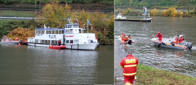 Wasserrettungseinheiten übten den Notfall auf dem Neckar (Fotos: privat)(bro) (de) Am vergangenen Samstagmorgen hatte die DLRG Teileinheiten des Wasserrettungszuges alle Hände voll zu tun. Im Rahmen der großen Kreisverbandsübung der DLRG KV Bergstraße hatten die Retter diesmal die Gelegenheit, auf und um die „Burg Eberbach“, einem Passagierschiff der Eberbacher Personenschifffahrt, ihr Können unter Beweis zu stellen. Galt es doch, mehrere verletzte Personen von Bord zu bringen.