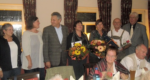 Drei Ehrenbriefe des Landes Hessen für Mitglieder des Skiclubs Hirschhorn (Foto: privat)(bro) (hn) Eine große Ehre wurde kürzlich den langjährigen und teilweise noch aktiven Vorstandsmitgliedern des Skiclubs Hirschhorn zuteil. Ellen König, Barbara Schmitt und Thomas Schreyer erhielten aus den Händen des Kreisbeigeordneten Volker Buser den Ehrenbrief des Landes Hessen für ihr ehrenamtliches Engagement im Verein. Dazu hatte der Skiclub in ein Hirschhorner Restaurant eingeladen.