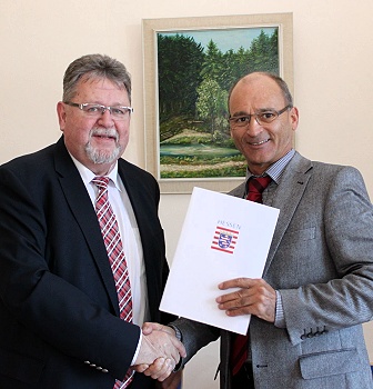 Anerkennungsbescheid aus Wiesbaden liegt vor Gund zur Freude für Bürgermeister Gottfried Görig (re.): Die Stadt am Berge ist ins Dorfentwicklungsprogramm des Landes Hessen aufgenommen worden. Den entsprechenden Anerkennungsbescheid überreichte Ministerialdirigent Werner Müller vom Hessischen Ministerium für Wirtschaft, Verkehr und Landesentwicklung am 31. Oktober im Beerfelder Bürgerhaus. (Foto: privat)(bro) (owk/wb) „Gäste mit solchen Schriftstücken sind bei uns gern gesehen“, sagte der Landrat des Odenwaldkreises Dietrich Kübler im Bürgerhaus in Beerfelden, als Ministerialdirigent Werner Müller aus dem Hessischen Ministerium für Wirtschaft, Verkehr und Landesentwicklung an Bürgermeister Gottfried Görig den Anerkennungsbescheid zur Aufnahme in das neue Dorfentwicklungsprogramm des Landes Hessen übergab.