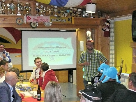 Der Steinbacher Sitzungspräsident Thomas Kurz und sein "Stegreifrednertalent" Büttenspritzer Udo Reubold waren ebenso in Form wie der Präsidentenkollege Robin Hemberger von der CGB, der mit einem Dreier aus "Ginneferscht" im Gepäck die Kampagne in multimedialer Weise gekonnt eröffnete. Gesteigert wurde dieser Vortrag von dem Verwandlungskünstler der Woche, Markus Müller. Von Wochentag zu Wochentag schraubte er die einzelnen Kostüme aus seinem "Astralkörper" und erhielt dafür den ersten Orden der neuen Saison. Auch die Verpflegung an diesem Nachmittag konnte sich sehen lassen. In der kurzen Begrüßung wies der Vorsitzende darauf hin, dass nun die "Casa Carnevale" fest im Besitz der CGB liege und nach der Kampagne 2013 der Öffentlichkeit vorgestellt werde, und dann jeder die Möglichkeit bekomme, einen Stein zu erwerben, um sich dort auch selbst zu verewigen. Auch der lieb gewonnene Narrhallamarsch kam an diesem Nachmittag nicht zu kurz. Jede Menge Gesichter aus den verschiedenen Tanzgruppen waren dank der ungezwungenen Fröhlichkeit nicht zu übersehen. Dies zeigte einmal mehr, dass es zwischen Jung und Alt bei der CGB sehr gut funktioniert, und man sich schon jetzt auf die bevorstehende Kampagne freuen kann.