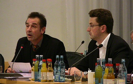 Neue Gaspreise und Abwassergebühren - Gewerbesteuer beflügelt den Haushalt (Foto: Hubert Richter)(hr) In der heutigen Gemeinderatssitzung stellten die beiden Werkleiter Stefan Schwarz und Jürgen Wenzler (unser Bild, v.l.) den Entwurf für den Wirtschaftsplan 2013 der Stadtwerke vor.