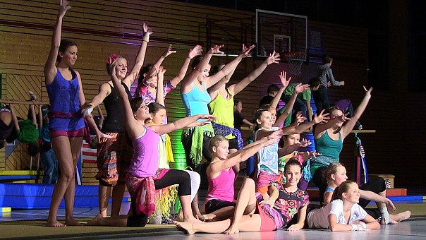 Aus dem Weltraum kamen gleich zu Beginn die Kleinsten vom Zwergen-, Kleinkinder- und Eltern-Kind-Turnen angereist, bevor die Badmintonspieler ins Fledermauskostüme schlüpften und als "Batminton"-Abteilung die "Flederbälle" fliegen ließen. Japan ist die sportliche Heimat der Judokas, die wieder einen Querschnitt ihrer Übungen zeigten. Hip-Hop-orientierten Jazztanz zeigte die junge Gruppe "Swaggerific", und der Basketballnachwuchs huldigte als "Little Stars and Stripes" der Heimat seiner Sportart Amerika. Gegen Ende des ersten Programmteils riefen die Jungs und Mädchen des Allgemeinen Turnens "Sommer, Sonne, Strand und Meer" in Erinnerung.
