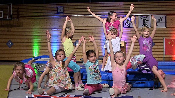 Aus dem Weltraum kamen gleich zu Beginn die Kleinsten vom Zwergen-, Kleinkinder- und Eltern-Kind-Turnen angereist, bevor die Badmintonspieler ins Fledermauskostüme schlüpften und als "Batminton"-Abteilung die "Flederbälle" fliegen ließen. Japan ist die sportliche Heimat der Judokas, die wieder einen Querschnitt ihrer Übungen zeigten. Hip-Hop-orientierten Jazztanz zeigte die junge Gruppe "Swaggerific", und der Basketballnachwuchs huldigte als "Little Stars and Stripes" der Heimat seiner Sportart Amerika. Gegen Ende des ersten Programmteils riefen die Jungs und Mädchen des Allgemeinen Turnens "Sommer, Sonne, Strand und Meer" in Erinnerung.